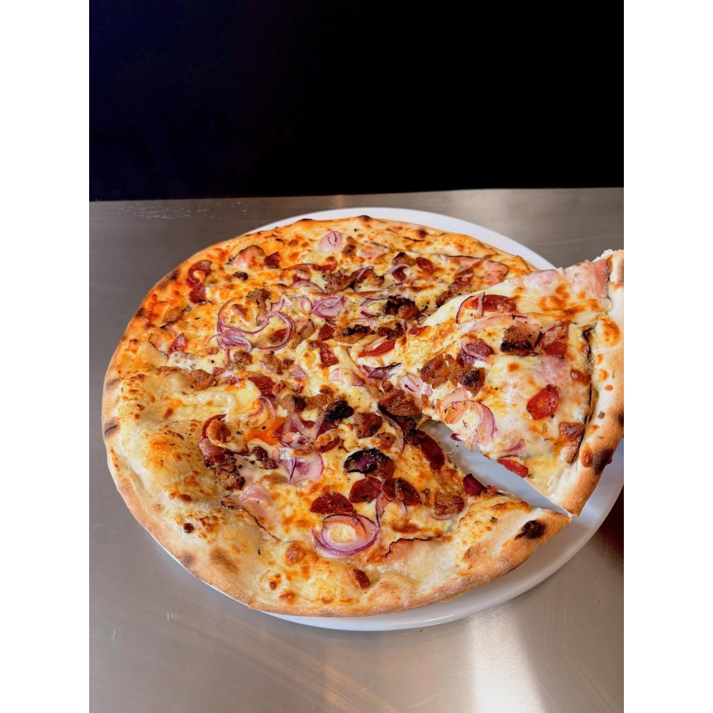 (Brynzový základ, oravská slanina, česnek, mozzarella, tatranská rolka, sekané škvarky, cibule, sýrové nitě)