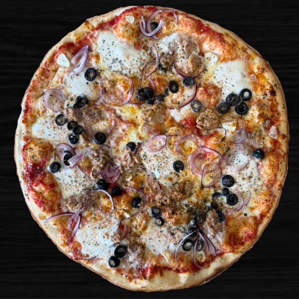 Drcená rajčata, červená cibule, mozzarella plátková, tuňák, olivy, čerstvý česnek