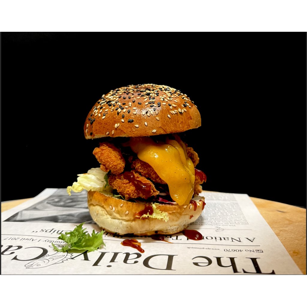 (Salát, nakládaná cibulka, bylinkový dresing, kuřecí stripsy sweet chilli 100g, red cheddar, barbecue dresink)