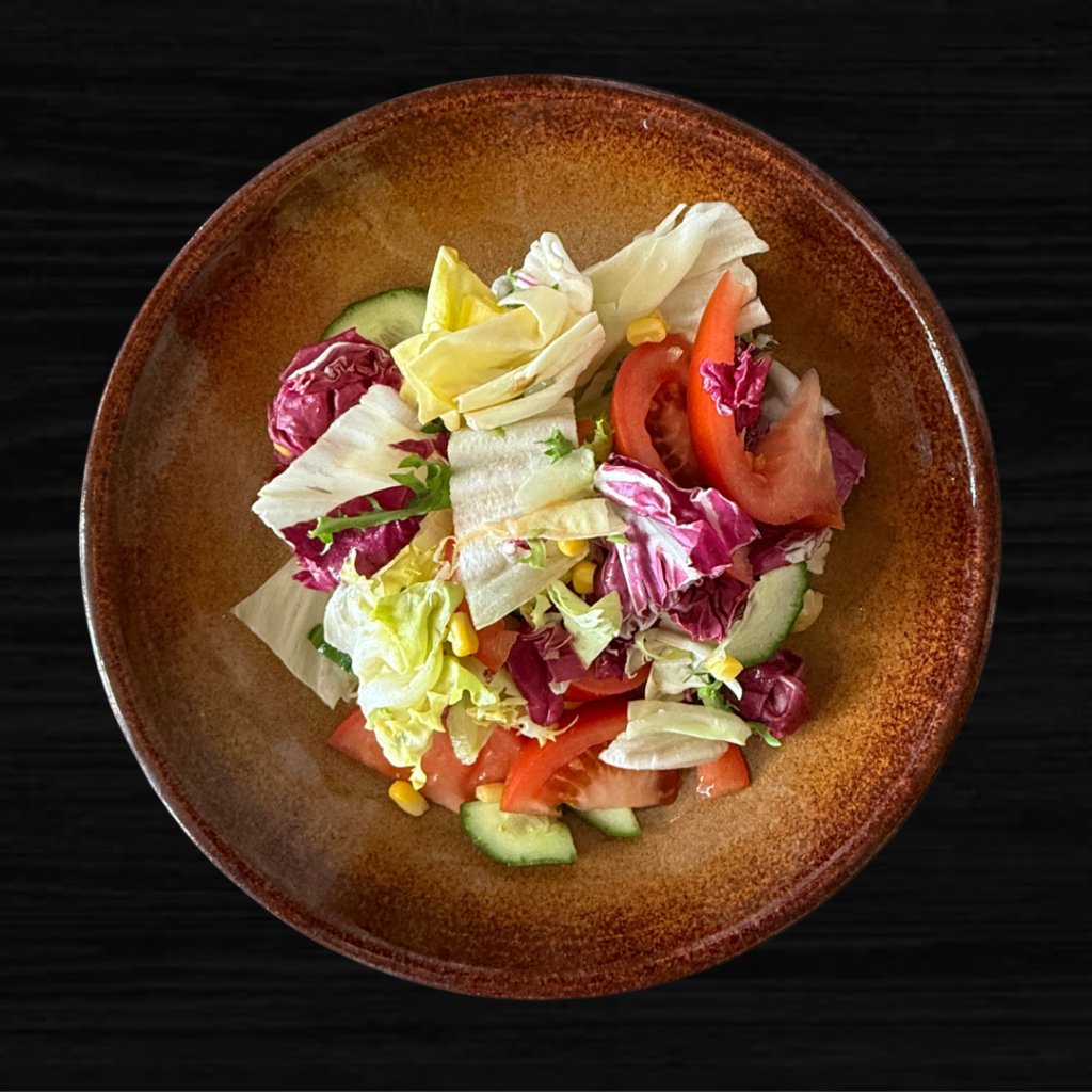 Mix salátů, kukuřice, rajče, salátový okurek, salátová zálivka