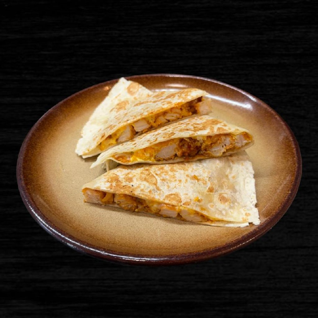 (Zapečená tortilla, kuřecí stripsy sweet chilli, gouda - cheddar mix, BBQ dresink, sýrový dresink)