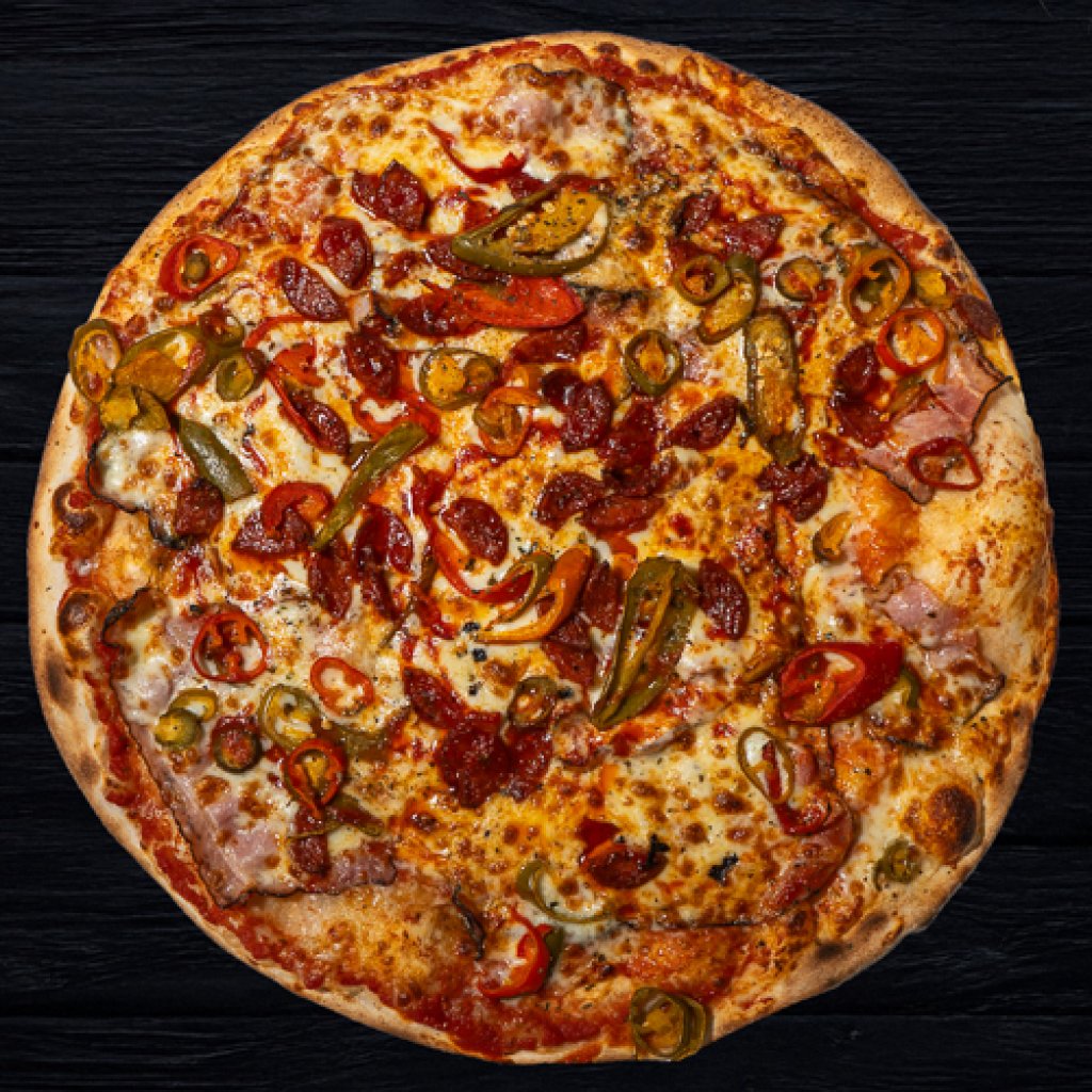 (Drcená rajčata, mozzarella, anglická slanina, feferony, maďarská klobáska, chilli