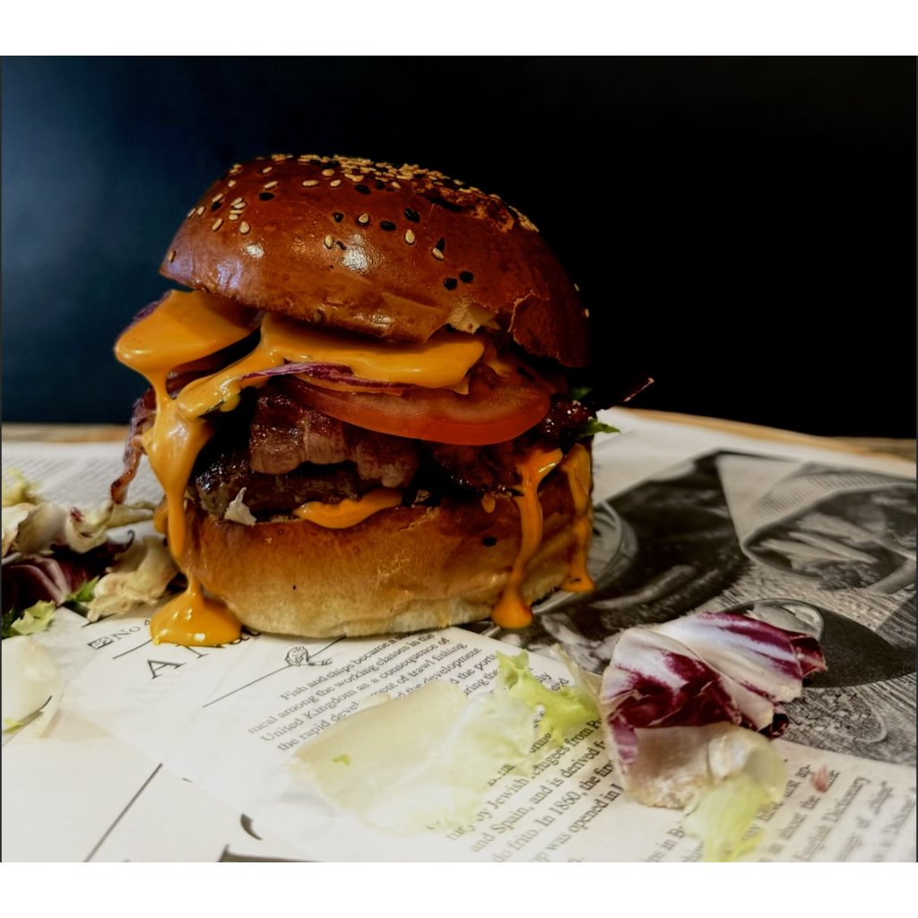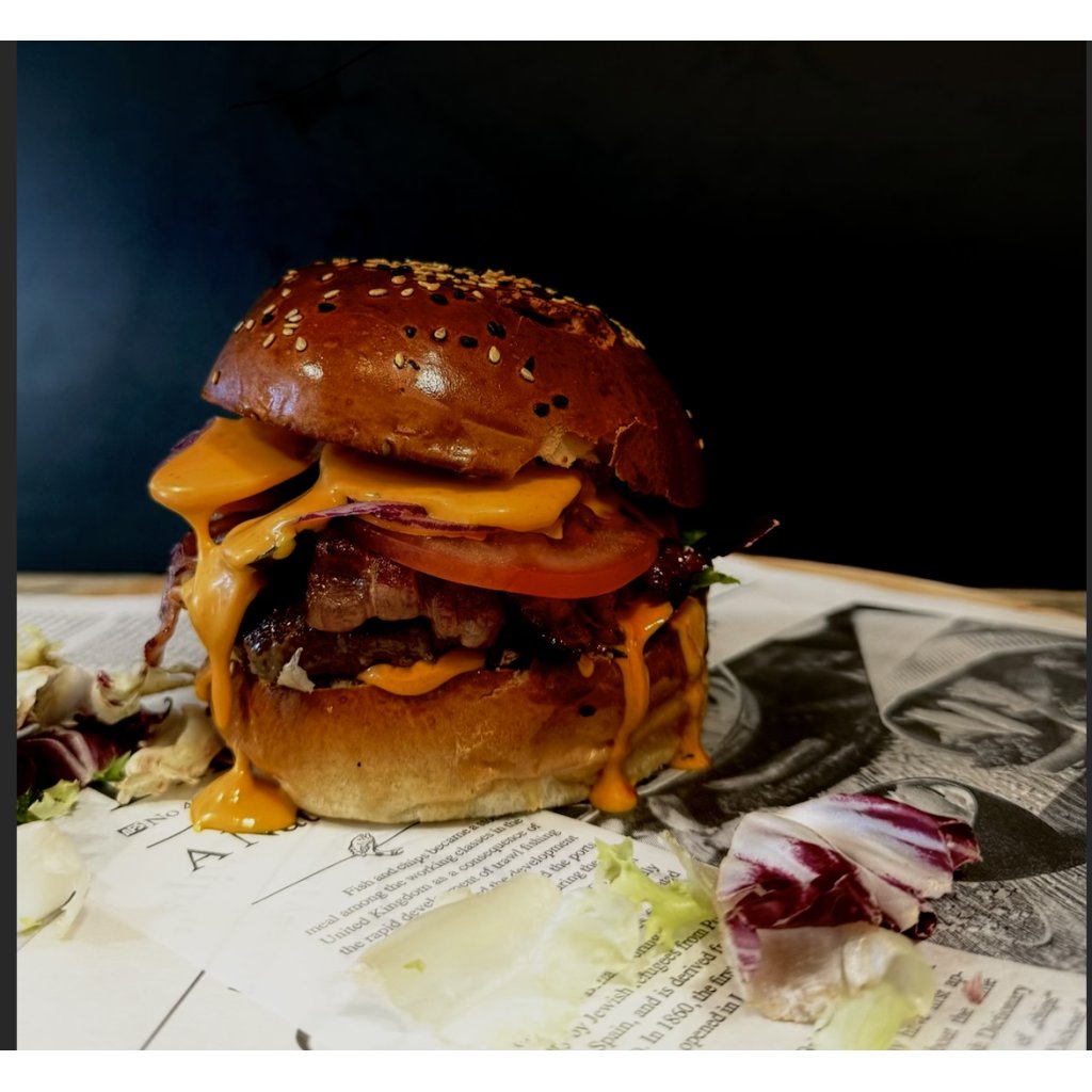 (Hovězí maso 180g, opečená raw slanina, rajče, nakládaná okurka, červená cibulka, salát, francouzský dresink, hranolky)