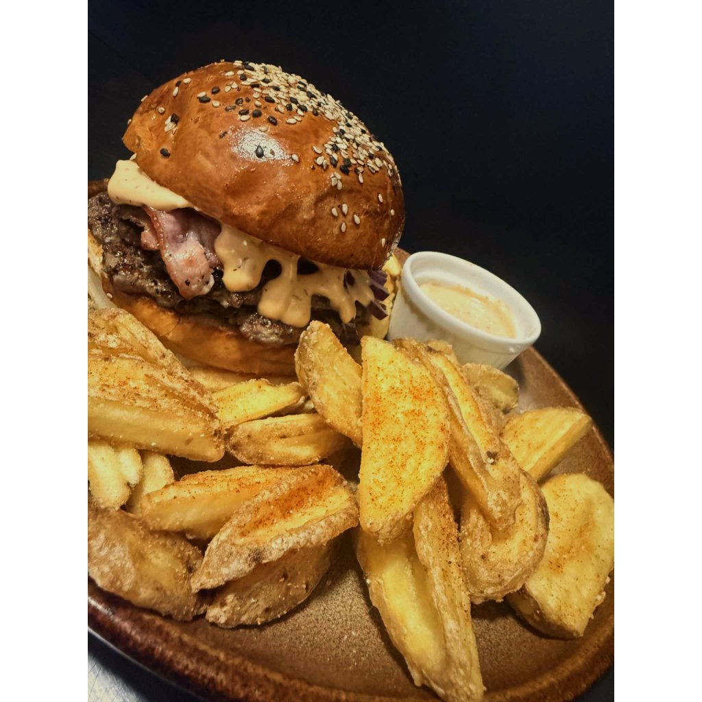 (Hovězí maso, salát, cibule, nakl. okurek, raw slanina, slaninový dresink a bramborové véčka)