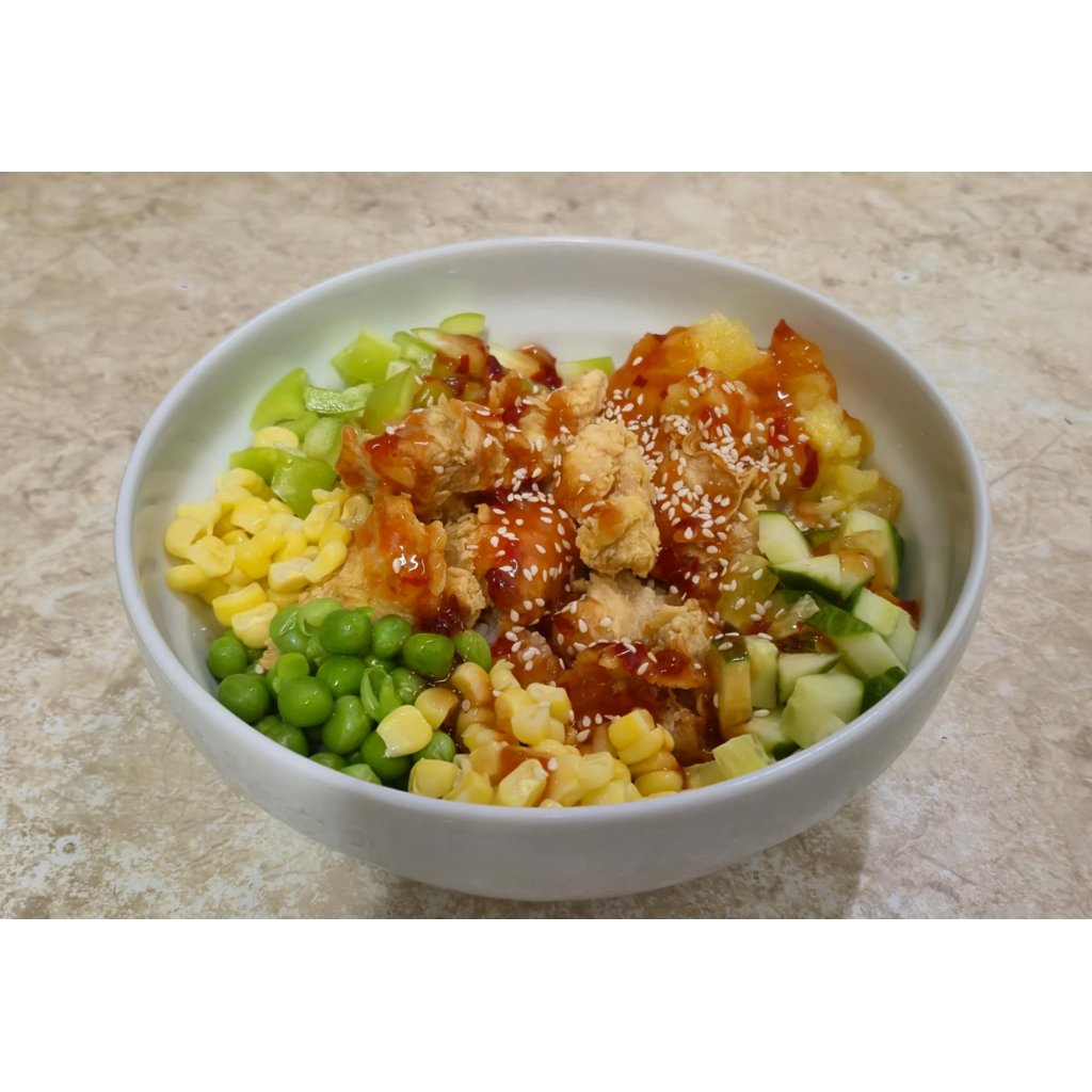Rýže, kuřecí maso obalované v těstíčku, ananas, okurka, kukuřice, hrášek, paprika, sladkokyselé chilli, sezam